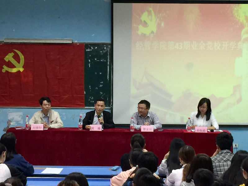4月7日,经管学院第43期业余党校开班典礼如期举行并圆满结束。到场的领导有yl6776永利集团党委宣传部副部长兼党校校长黄瑜、经管学院党委副书记曾友田、经管学院学工办主任兼团委书记刘修财、学工办副主任吴钰娟。