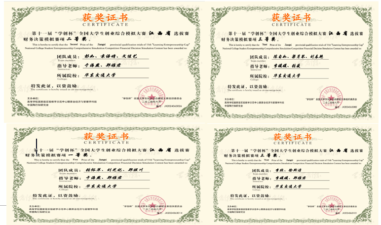 近日,第十一届“学创杯”全国大学生创业综合模拟大赛财务决策模拟赛项江西省级选拔赛获奖名单公布,由我院于海燕老师、李媛媛老师、郑雅君老师以及张薇老师指导的学生们表现优异,参赛的四支团队全部获奖,总共获得了江西赛区本科生一等奖及二等奖各一项,三等奖两项的好成绩,其中由我院于海燕老师和郑雅君老师指导的2022级会计学(CMA)专业的张裕萍、彭如等同学荣获一等奖及二等奖,由我院李媛媛老师和张薇老师指导的2022级(国际会计)专业的李欣及陈自如等同学荣获三等奖。本次大赛是由高等学校国家级实验教学示范中心联席会经济与管理学科组和中国陶行知研究会主办、南昌大学、江西应用科技学院承办,为2024年全国普通高校学科竞赛排行榜赛事。本财务决策模拟赛项今年是第一次举办,全省总共有81所院校、161支队伍参赛。本次大赛的主旨是进一步提高同学们对财务决策的综合运用及分析能力、加强对财务的实际运用能力。自今年3月份开赛以来,我院高度重视本次大赛,专门派遣老师参与大赛培训,团队指导教师们也不辞辛苦的每天给学生们开通训练的机会,耐心指导及跟踪同学们的每次训练,积极解决学生们遇到的难题,在赛前亲切的为学生们加油鼓劲,在比赛中与同学们一起研究如何应对各种问题。今后,我院将继续推进各项赛事的公布与指导,不断提升学生们的实践能力、培育出更多优秀人才。