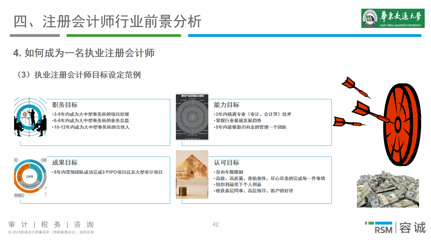 接下来,钟俊先生介绍了会计人的职业规划方向,钟俊先生详细说明了“做会计的”“查会计的”“管会计的”“研究会计的”这四类职业发展路径。他特别提到注册会计师行业,通过数据分析展示了其收入增长和人员规模变化。钟俊先生还深入分析了注册会计师的社会定位、应具备的素质、职业发展阶段以及成为执业注册会计师的途径,并结合个人经历为同学们指点迷津。