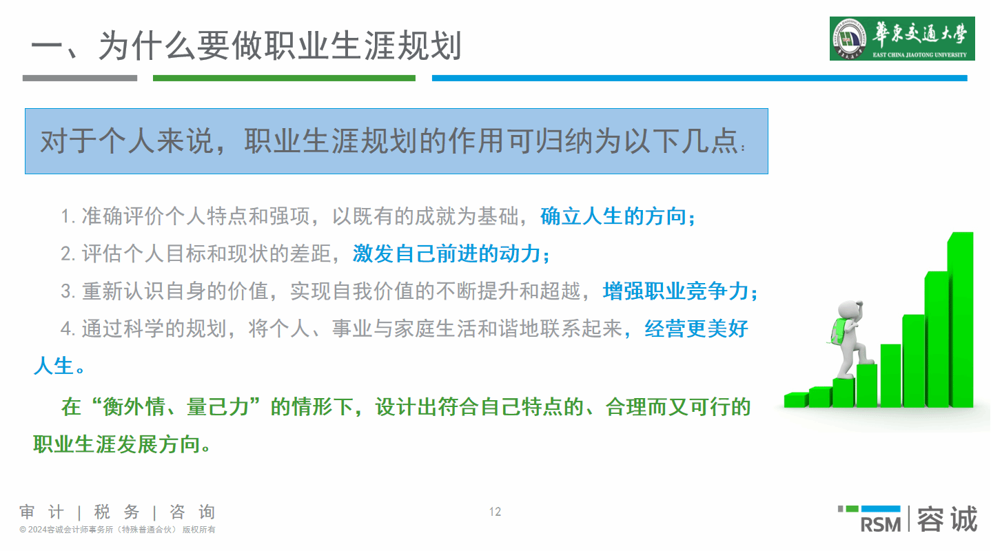 钟俊先生进一步阐述,对于个人而言,职业生涯规划能助力准确评价自身特点与强项,确立人生方向;评估目标与现状差距,激发前进动力;实现自我价值提升与超越,增强职业竞争力;还能将个人、事业与家庭生活和谐关联,经营美好人生。