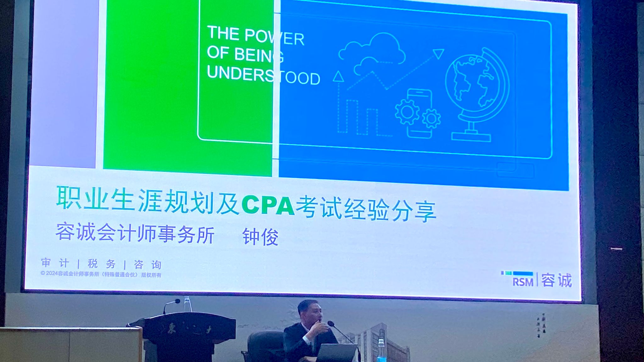 2024年11月6日晚19:00,经管学院于南区202报告厅成功举办了一场以《职业生涯规划及CPA考试经验分享》为主题的讲座,旨在提升同学们的职业生涯规划意识,助力其合理规划大学生活。本次讲座特邀中国注册会计师、容诚会计师事务所业务合伙人、内核委员会委员钟俊先生主讲, ACCA、国会、CMA专业全体同学参与。
