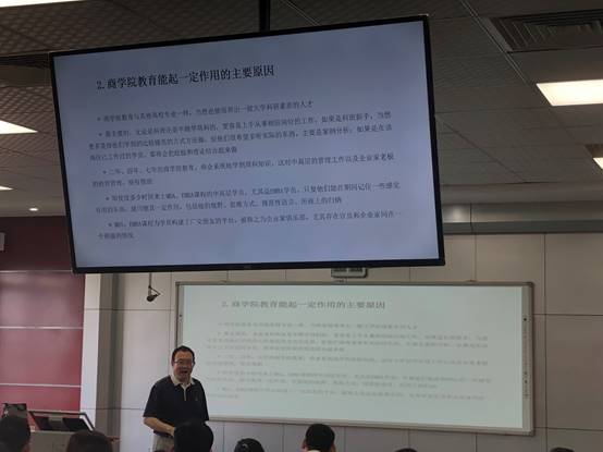 再次,史教授向大家展示了一份调查数据,发现我国第一代企业家大多是小商贩、工人等知识水平不高的人员,比如:史玉柱;第二代企业家多是理工科专业的人员,比如:李彦宏;第三代企业家才多为商科专业出身,比如:孟晚舟。史教授认为,这其中与国家发展和国际形势有关,随着商业社会越来越规范,商学院教育更能起到一定的作用。