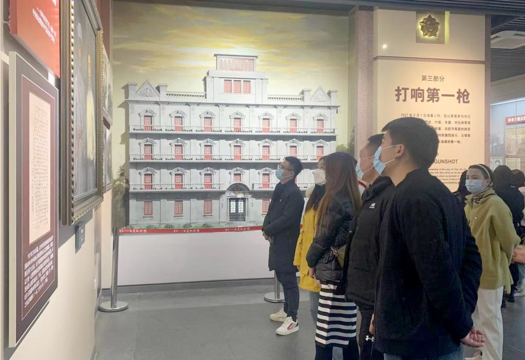 在南昌八一起义纪念馆内,同学们边走边看,不时询问交流,深入学习了解我们党打响武装反抗国民党反动派的第一枪的光荣历史。通过一件件包含历史沧桑的武器装备,一幅幅感人至深、舍生取义的历史图片,配合声光电等技术,全景感悟到南昌起义的历史全貌和革命年代共产党人艰苦卓绝、不怕牺牲的伟大精神。