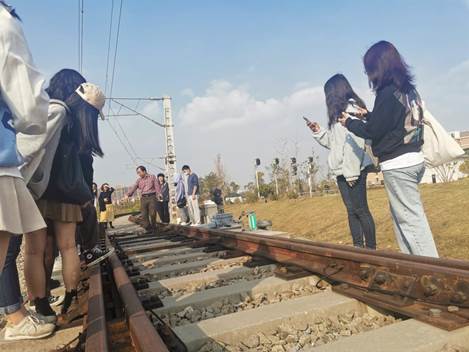 轨道交通基地的老师首先向同学们介绍我国机车的各种类型、型号及构造,不同类型机车铁轨的构成及区别,铁路上各物件的作用及工作原理。在参观过程中同学们好奇心、求知欲旺盛提出了很多问题,指导老师针对同学们的问题亲切地一一作出解答。