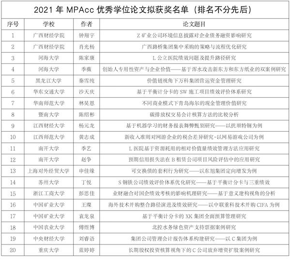 学位论文是衡量研究生培养质量的重要标志。全国MPAcc优秀学位论文评选工作由全国会计专业学位研究生教育指导委员会组织,每年评选一次,全国共计200多家培养单位推荐参选论文。评审环节包括形式审查、匿名评审、专家会评、教指委审批和公示等多个环节,今年最终评选2021年全国MPAcc优秀学位论文20篇。