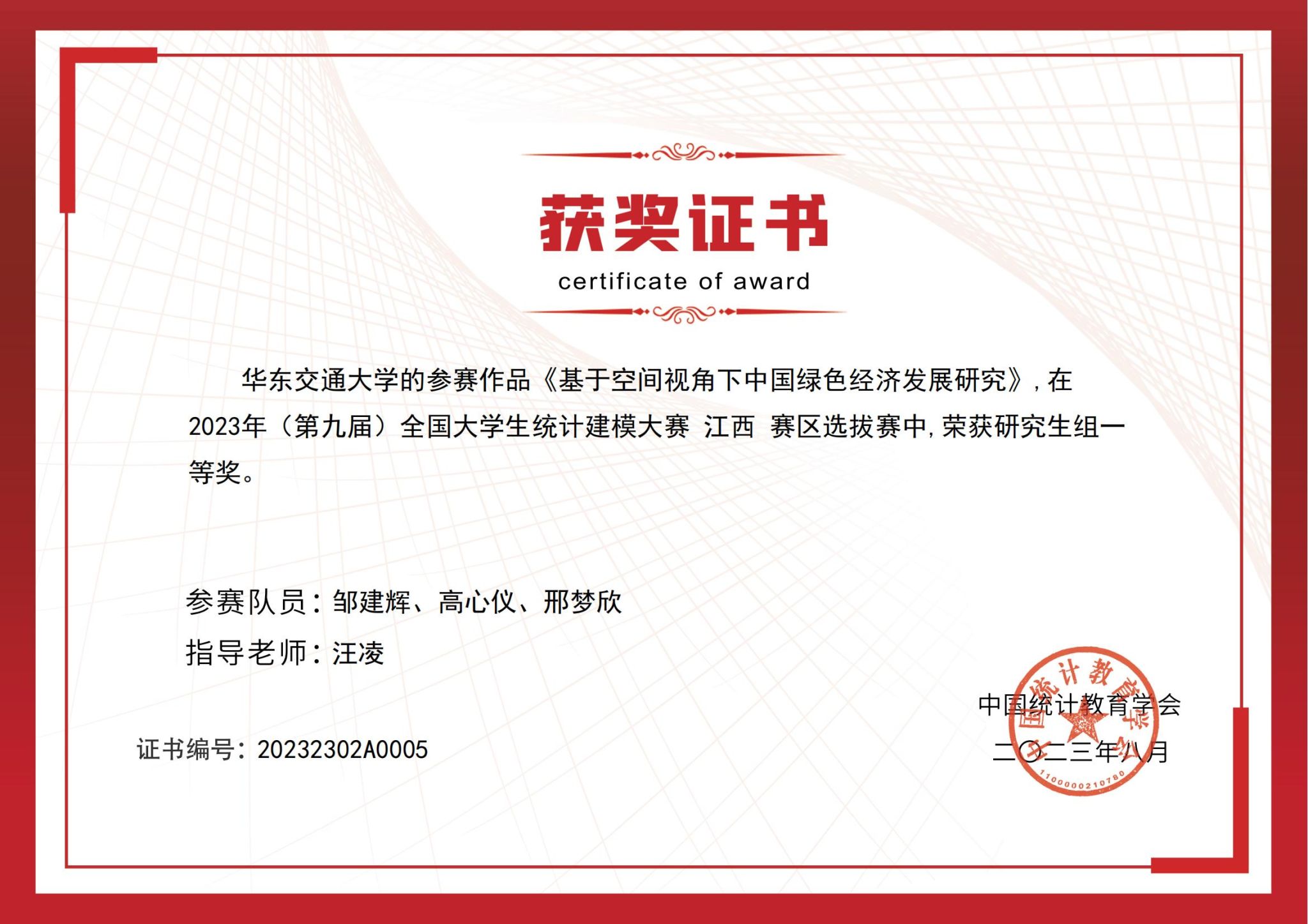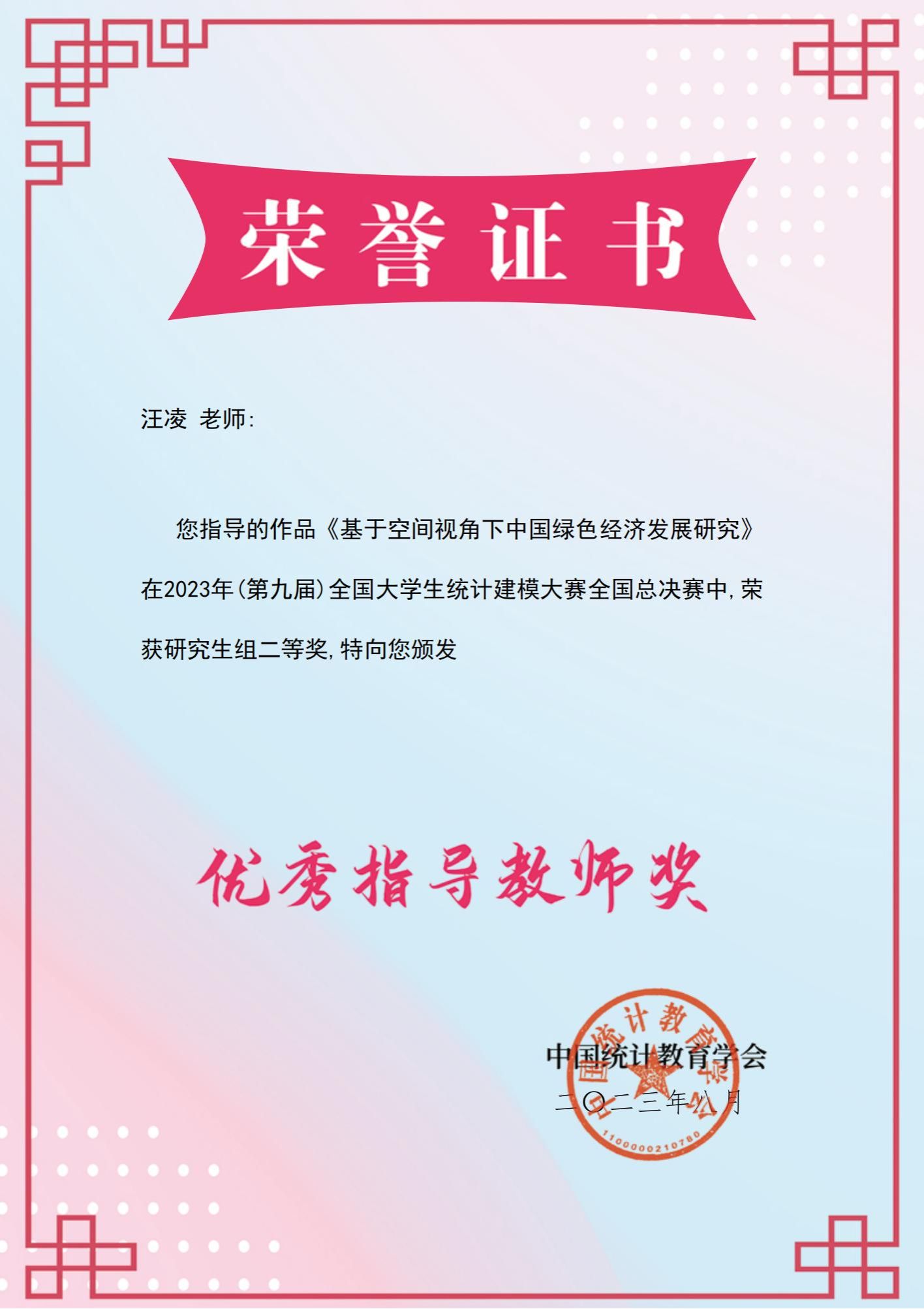 本届大赛主题是“中国式现代化的统计测度”,大赛自2023年3月启动以来,学院高度重视,积极统筹推进备赛工作。汪凌老师就论文选题、撰写、修改到最终的答辩环节均对邹建辉同学团队进行悉心指导,全面提升了学生统计建模、论文撰写、学术答辩等能力。本次大赛充分展示了我院学生运用统计方法进行数据处理、数据分析、数据挖掘的能力和创新思维意识。