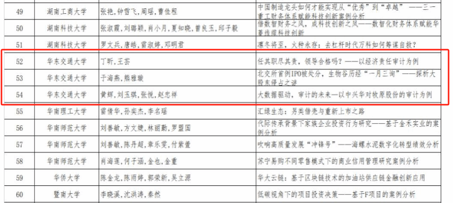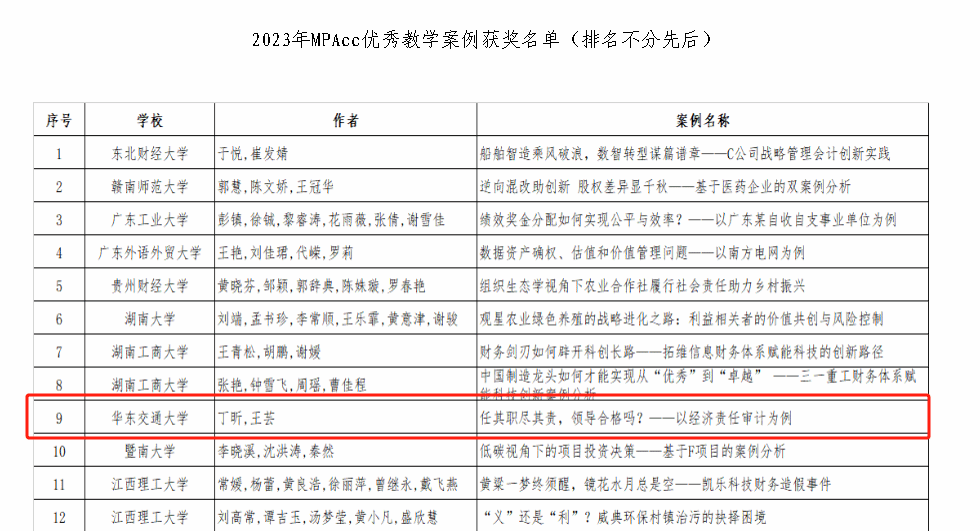 5月8日,由全国会计专业学位研究生教育指导委员会指导,联合多家MPAcc培养单位共同发起的会计硕士专业学位(以下简称MPAcc)优秀教学案例评选结果公布。我院丁昕、王芸老师撰写的教学案例获得2023年MPAcc优秀教学案例奖。同时,丁昕、王芸老师撰写的《任其职尽其责,领导合格吗?——以经济责任审计为例》、于海燕、熊雅璇撰写的《北交所首例IPO被处分,生物谷历经“一月三询”——探析大股东侵占之谜》以及黄辉、刘玉琪、张悦、赵忠祥撰写的《大数据驱动,审计的未来—以中兴华对牧原股份的审计为例》三个教学案例入选2023年MPAcc优秀教学案例库。