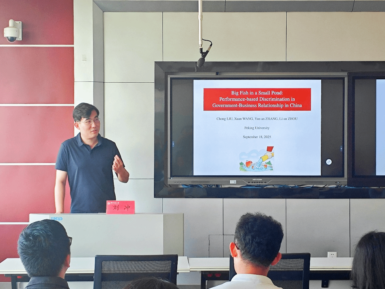 为提升论文发表质量,推动学术思想碰撞,助力科研创新发展,9月18日下午,我院邀请北京大学博雅青年学者、副教授刘冲举办报告主题为“Big Fish in Small Pond: Performance-based discrimination in Government-Business Relationship in China”的学术讲座。6776永利集团共计三十余名师生参与了此次讲座,讲座由副院长周才云教授主持。