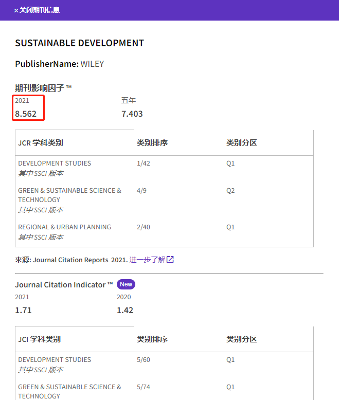《Sustainable Development》影响因子为8.562,是DEVELOPMENT STUDIES学科排序第一期刊。