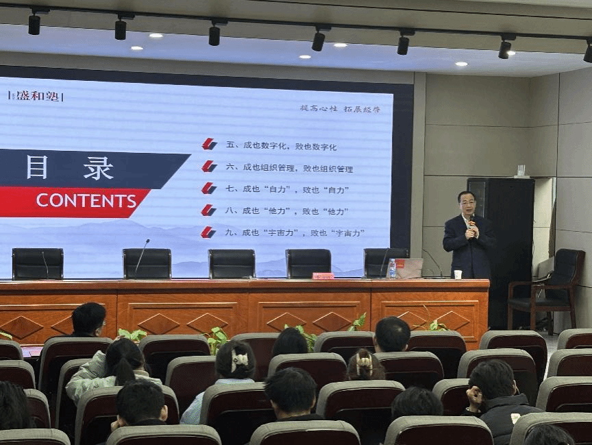 会议伊始,周才云教授介绍了章一鸣博士的基本情况和学术成就,并对其表示热烈欢迎。章一鸣博士从政商关系、多元化、负债率、企业文化、数字化、组织管理、“自力”、“他力”和“宇宙力”等九个大方面深刻阐述了企业发展的逻辑,并借海南航空、万科企业等多个案例探讨企业成功的关键因素。随后,他建议各位同学在人生发展规划方面要借鉴企业发展中的未雨绸缪、保持“利他”心态。最后,章一鸣博士分享了一些成功企业家的相关经历,鼓励大家积极做好向上向善新时代好青年。