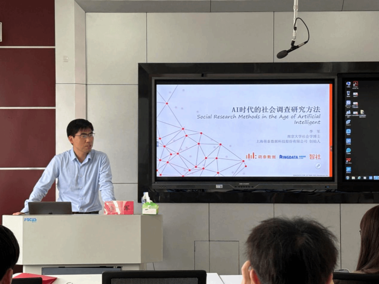 李军博士首先向与会师生介绍了人工智能的发展历史、三个学派及它们之间的社会学关系。随后,从人工智能时代这个大背景来引出人工智能在社会科学研究领域中的应用,并将其归纳为自动化和效率提升、数据分析与预测两方面。其次,介绍了调查技术的发展、调查的各种形式和国内大型学术调查的案例。最后,借访谈研究、大数据研究、互联网实验研究和文献研究等多个案例阐述本次讲座的重点-数智时代,多种研究方法可以融合运用。