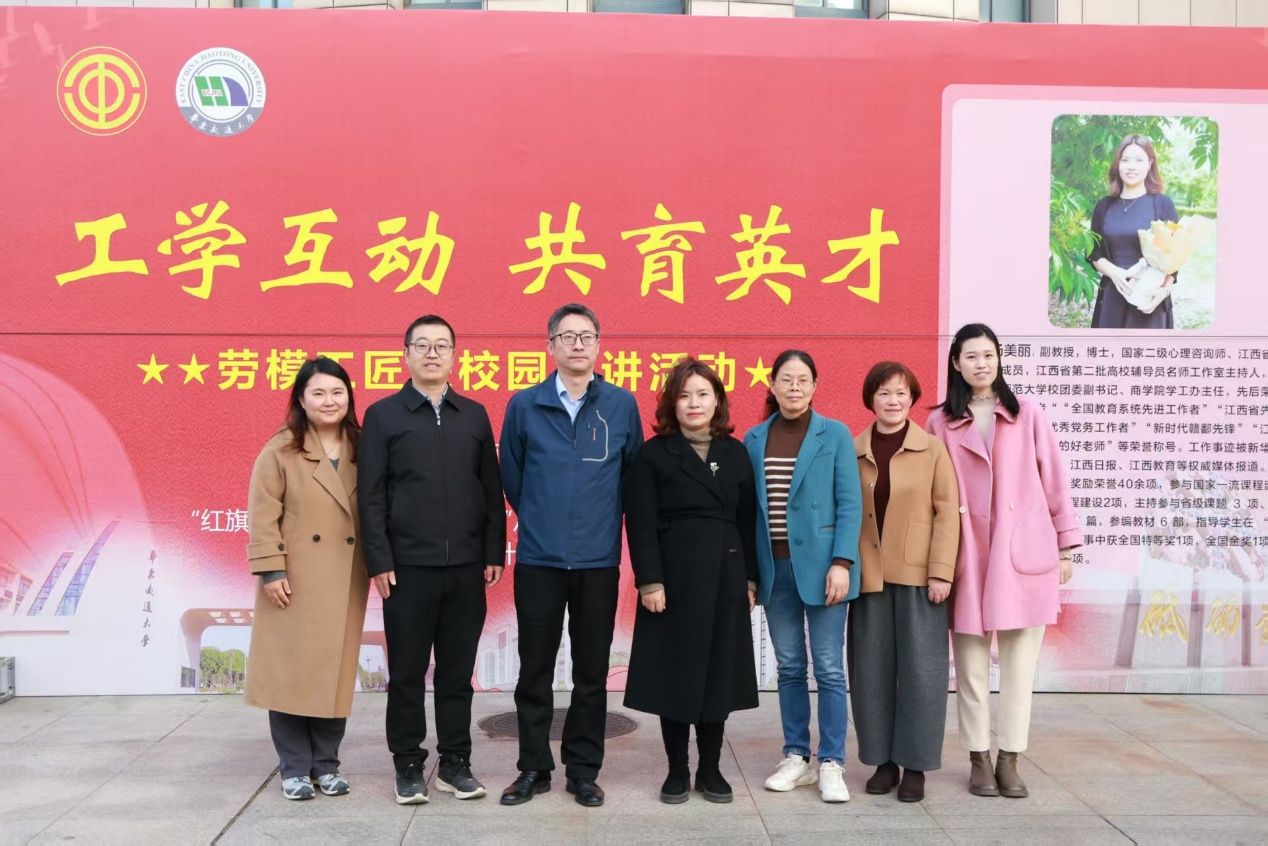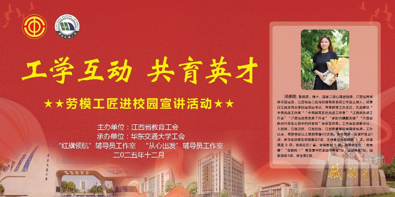 2025年12月3日,“工学互动 共育英才”暨“劳模工匠进校园”宣讲会在我校举行。“全国教育系统先进工作者”、江西师范大学校团委副书记汤美丽应邀做“扎根育人沃土,传承劳模精神”专题宣讲。