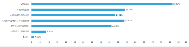 由此,学院为更好地了解广大学子对运动的关注度、在体育锻炼方面的情况,进而帮助学校内相关部门更好地开展活动,经管青年研究中心联合权益部开展了对大学生体育锻炼情况的调查活动——《全员运动,健康经管调研报告》,本次活动针对我院在校本科生共发放604份有效问卷,并由此进行了深入的研究调查。调查结果显示:81.62%的同学选择了强身健体,54.14%的人选择提高体测分数,53.81%选择加强个人团结意识,体育竞技精神,48.34%的同学选增进同学之间的感情,46.36%的人选择能学习自己感兴趣的项目。只有8.77%的同学认为没有意义,因为自己不喜欢运动。在1.82%的其他选择中,有人认为会占用平时时间,浪费时间,对他个人来讲没有用处所以是没有意义的。