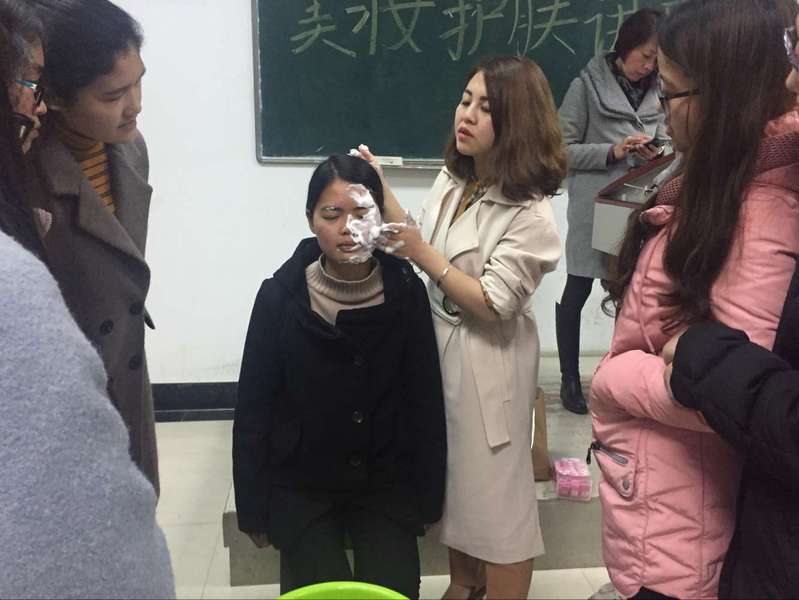 本次活动一共分为三个环节,第一个环节为讲师经验分享,李芬老师给同学们讲解了“护肤那些事”。包括常见的皮肤问题有哪些,这些皮肤问题出现的原因,平常护肤应该如何做,有哪些注意事项等。接下来同学们亲身体验,由同学们自愿报名体验李芬老师的专业洁面和水疗,大家一起分享感受。第三个环节即抽奖环节,抽奖环节又分为三轮,分别穿插在开始、中间和结束。奖品全部都是由校妆网提供,为女生们的美丽保驾护航。