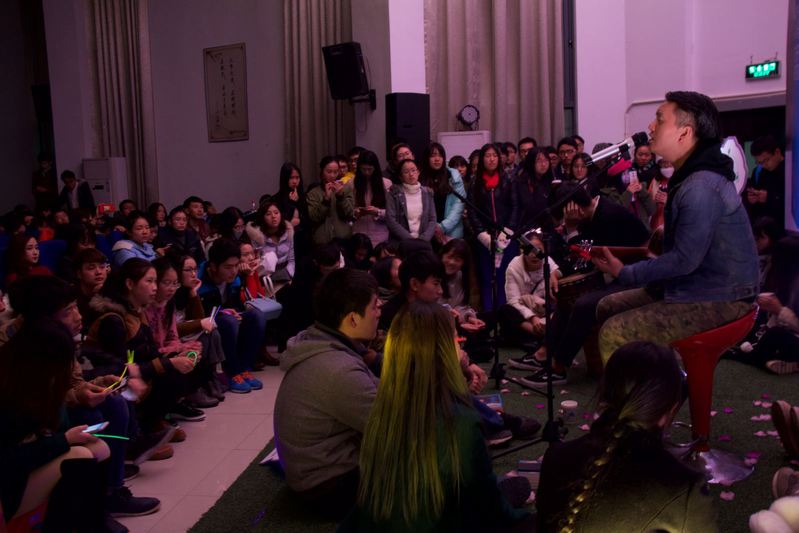 “你是我的野生作家,我是你的亲生读者。”11月24日晚,大冰小屋中的歌手陈硕和罗小七受大冰的委托走出书屋,代替大冰来到yl6776永利集团看望我们。窗外寒风凛冽,南区逸夫楼中传出温暖的歌声。