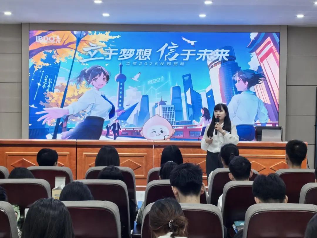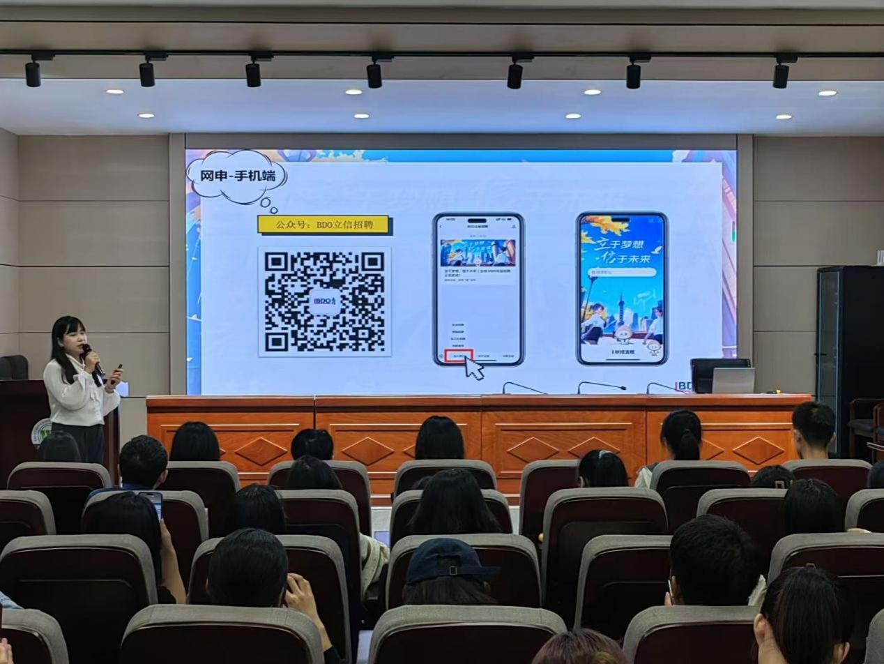 立信前海的人力资源部老师通过两段宣传片,向学生生动展示了事务所的风采和文化,同时详细介绍了立信的悠久历史、快速发展、持续增长的营收和团队规模、多元化的业务领域以及庞大的客户群体,从七个方面全面阐述了立信的优势和影响力,使学生们对立信有了更深刻的理解。