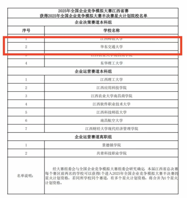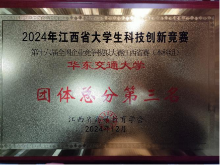 近日,第十六届全国企业竞争模拟大赛江西省赛在南昌职业大学举办,共有来自34所院校262支队伍参赛。我校多支队伍积极参与、表现优异,荣获本科组团体总分第三!其中,斩获一等奖两项、二等奖三项、三等奖一项。我校企业决策赛道本科组荣获1个星火名额(全省仅4所高校获得),直接进入2025年全国企业竞争模拟大赛。