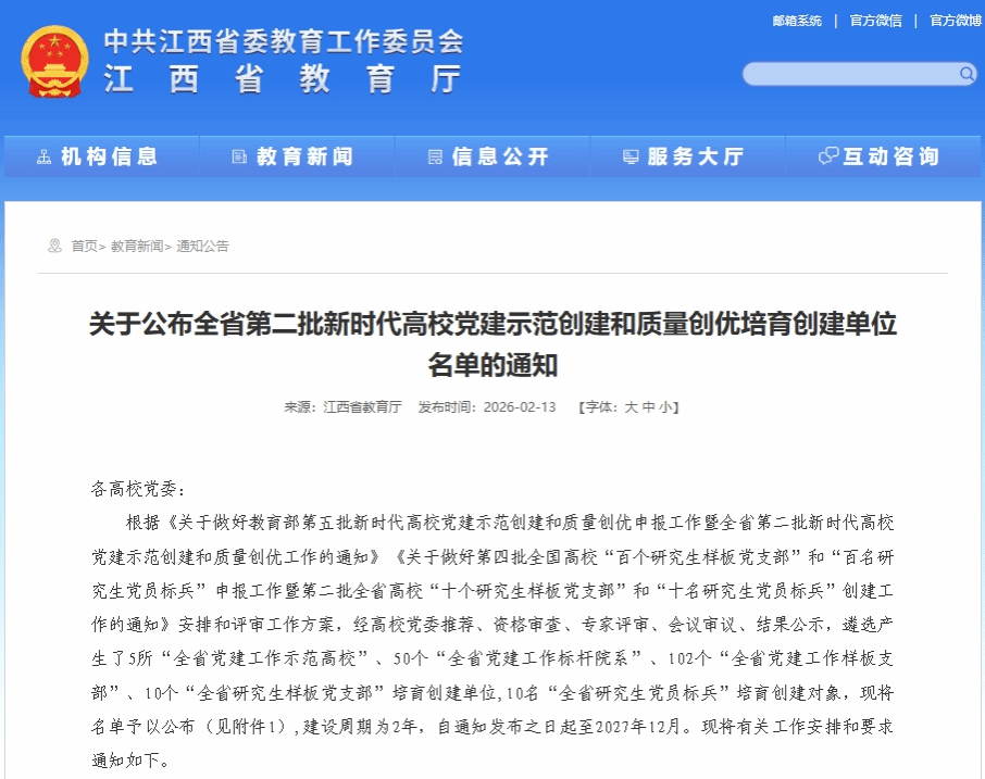 近日,中共江西省委教育工作委员会、江西省教育厅公布全省第二批新时代高校党建示范创建和质量创优培育创建单位名单,6776永利集团党委入选“全省党建工作标杆院系”创建培育单位。