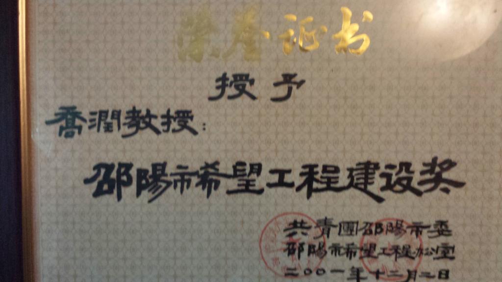 图三:2001年乔润教授获得“邵阳市希望工程建设奖”证书