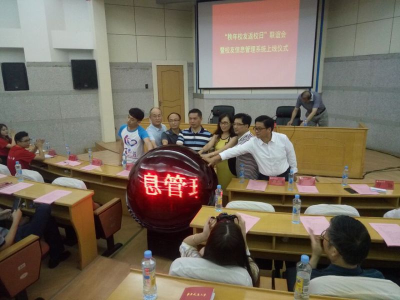 仪式最后,罗玉峰校长、校友工作办公室主任罗侃、现代教育技术中心主任黄卫春,毕业三十年、二十年、十年校友代表共同点亮启动球。