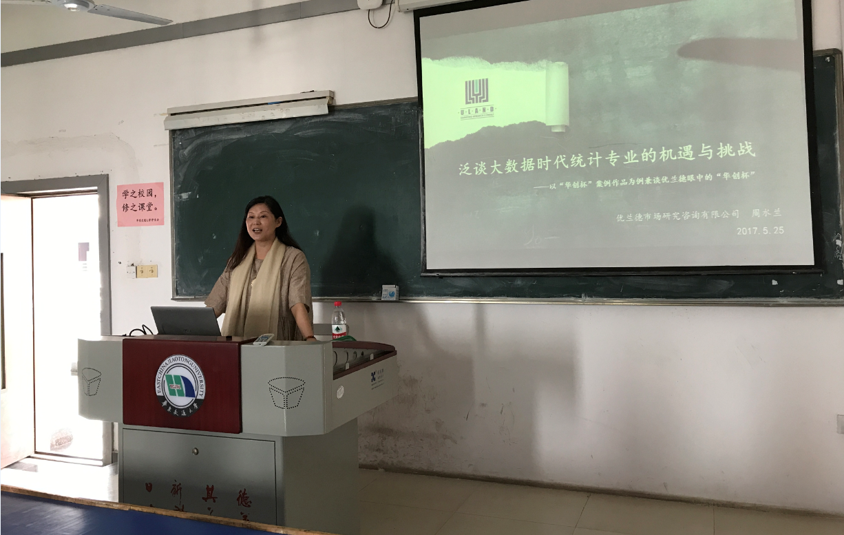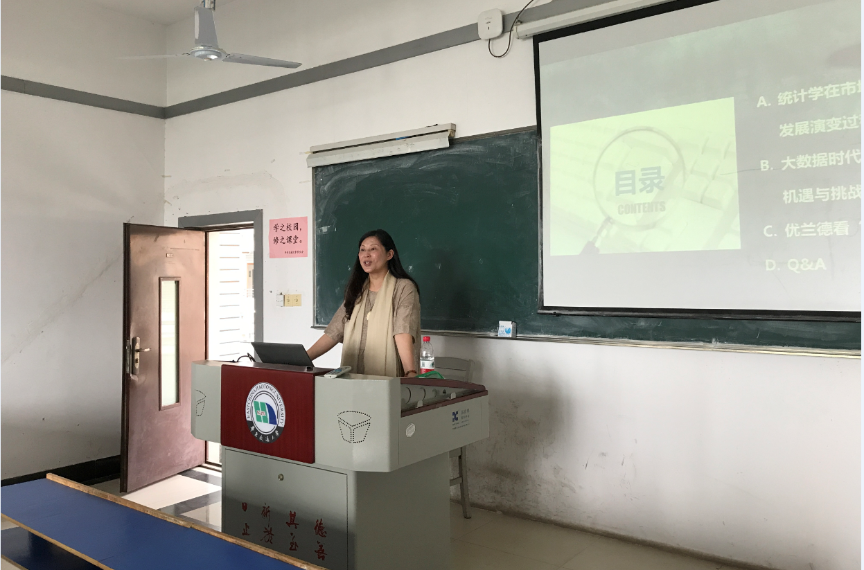 2017年5月25日下午,江西优兰德市场研究咨询有限公司董事长、总经理周水兰女士为我校15经济统计专业学生做了题为《泛谈大数据时代统计专业机遇与挑战》的讲座,周董事长结合自身行业经历和体会,从统计学在市场调查行业发展演变过程、大数据时代来临对统计学专业的机遇和挑战、优兰德看统计学专业学生要求等四个方面进行了精彩的讲演,最后和同学们进行了互动。