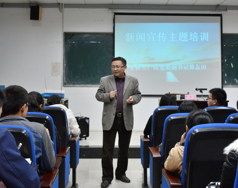 尽管寒风凛冽,634教室内洋溢着温暖的气息。晚7点左右,热情高涨的同学们已陆续到达会场等待曾友田的到来。学工处主任刘修财在讲座开始前强调了新闻写作的重要性并向同学们提出了认真领会讲座内容的要求。曾友田利用自己的休息时间,为讲座做了精心的准备,仔细而详尽地向学生骨干们讲述了如何做好新闻宣传工作。