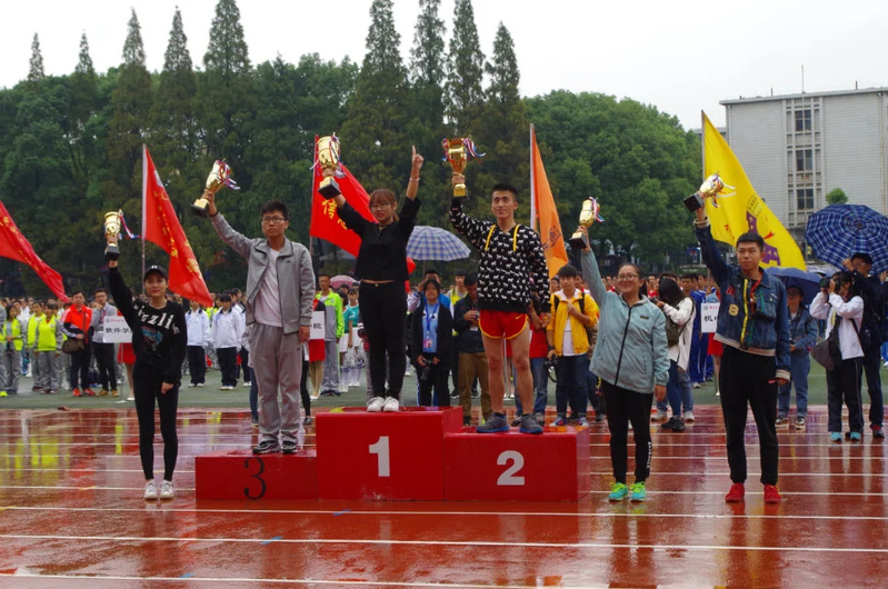经管学院在风雨中克服恶劣的天气,坚持完成三天的赛程。校团委副书记张剑锋宣布校体育文化团体总分排名,经管学院总分以91分排名全校第六,在第34届田径运动会体育道德风尚评比结果中经管学院荣获第五名。校长罗玉峰为经管学院颁发第34届田径运动团体奖田径团体奖杯。
