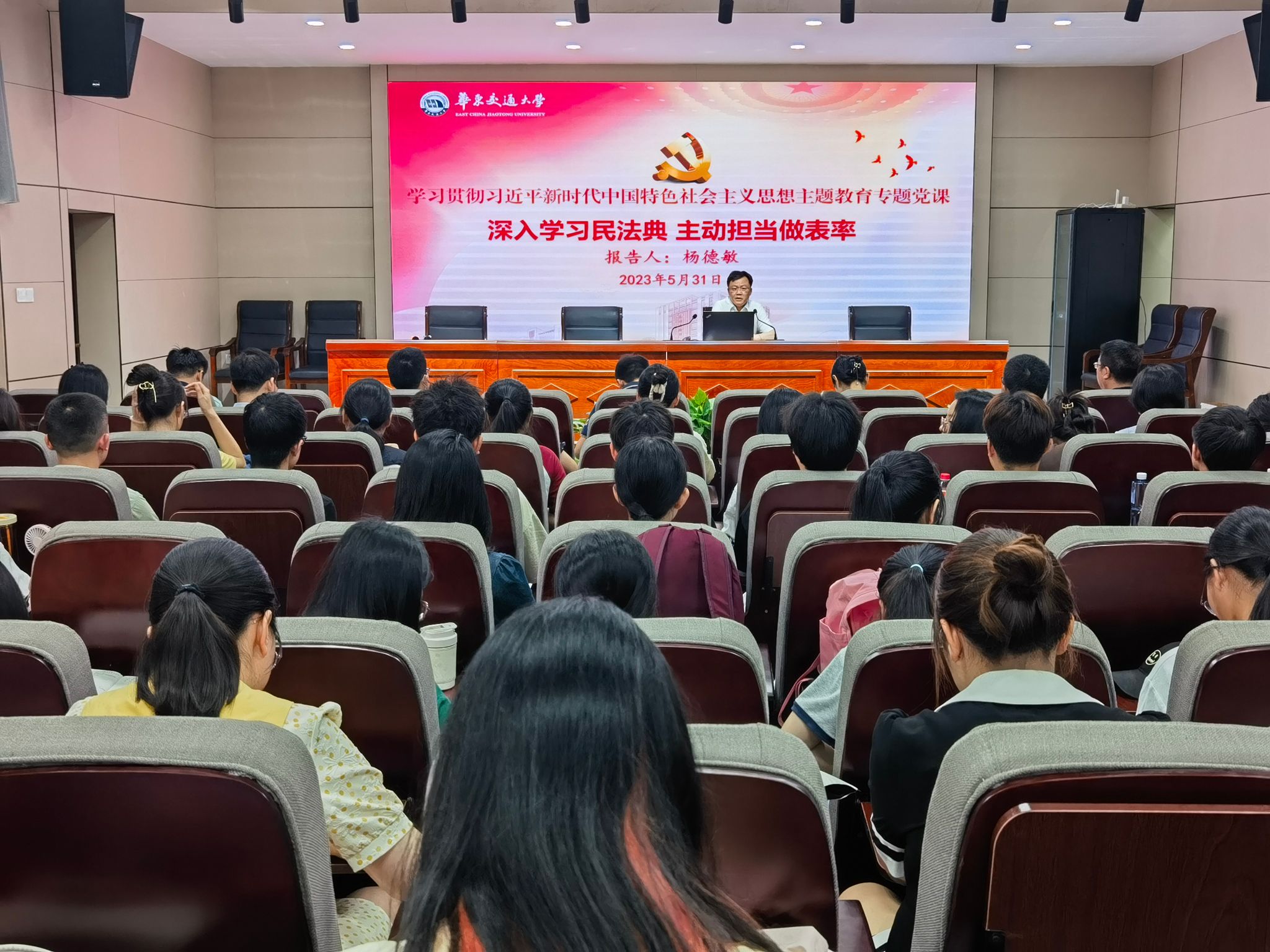 为深入开展学习贯彻习近平新时代中国特色社会主义思想主题教育,认真落实习近平总书记关于加强民法典学习宣传的重要指示精神。5月31日,校党委委员、副校长杨德敏教授以“深入学习民法典,主动担当作表率”为题,为我院统计与行政教工党支部讲授专题党课暨为2022级人力资源管理专业2、3班全体同学上思政课。